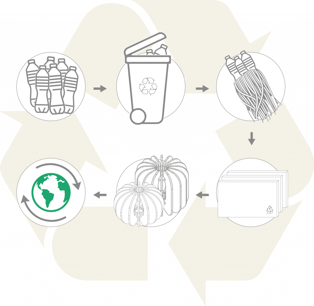 En nuestro compromiso con la sostenibilidad, trabajamos con PET proveniente de botellas de plástico recicladas. A través de un cuidadoso proceso, esas botellas se transforman en una fibra que, tras ser depurada, se convierte en placas de PET. Estas placas son el corazón de nuestros productos, ofreciendo no solo una segunda vida al plástico, sino también una que es estéticamente atractiva y funcional.